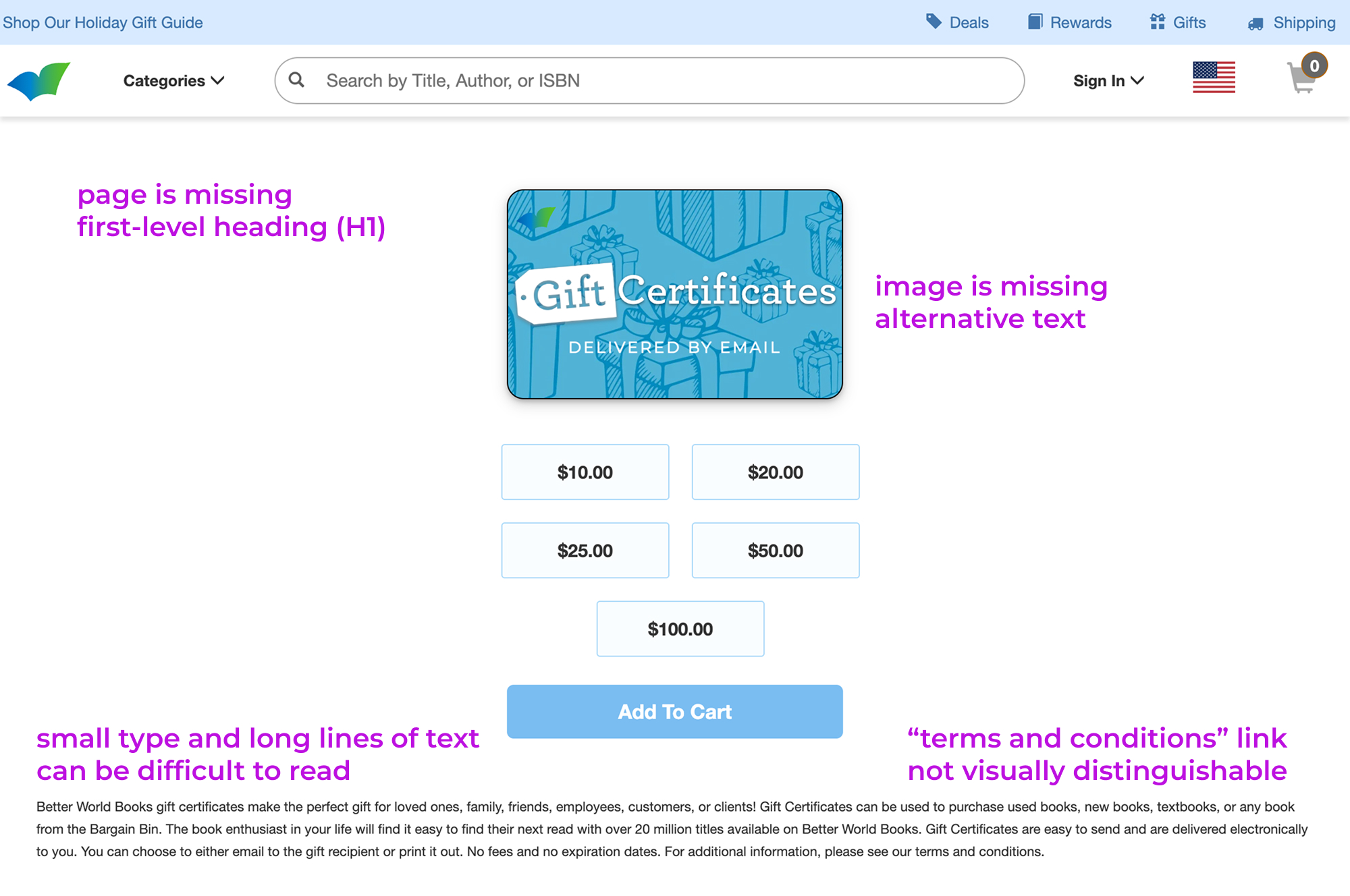 - The Web Content Accessibility Guidelines (WCAG) recommend avoiding text in images (such as “gift certificates delivered by email”). If you do use text in an image, the alternative text should match the words in the image. In this case, the image is missing alternative text, which may prevent users of assistive technology from accessing important content.