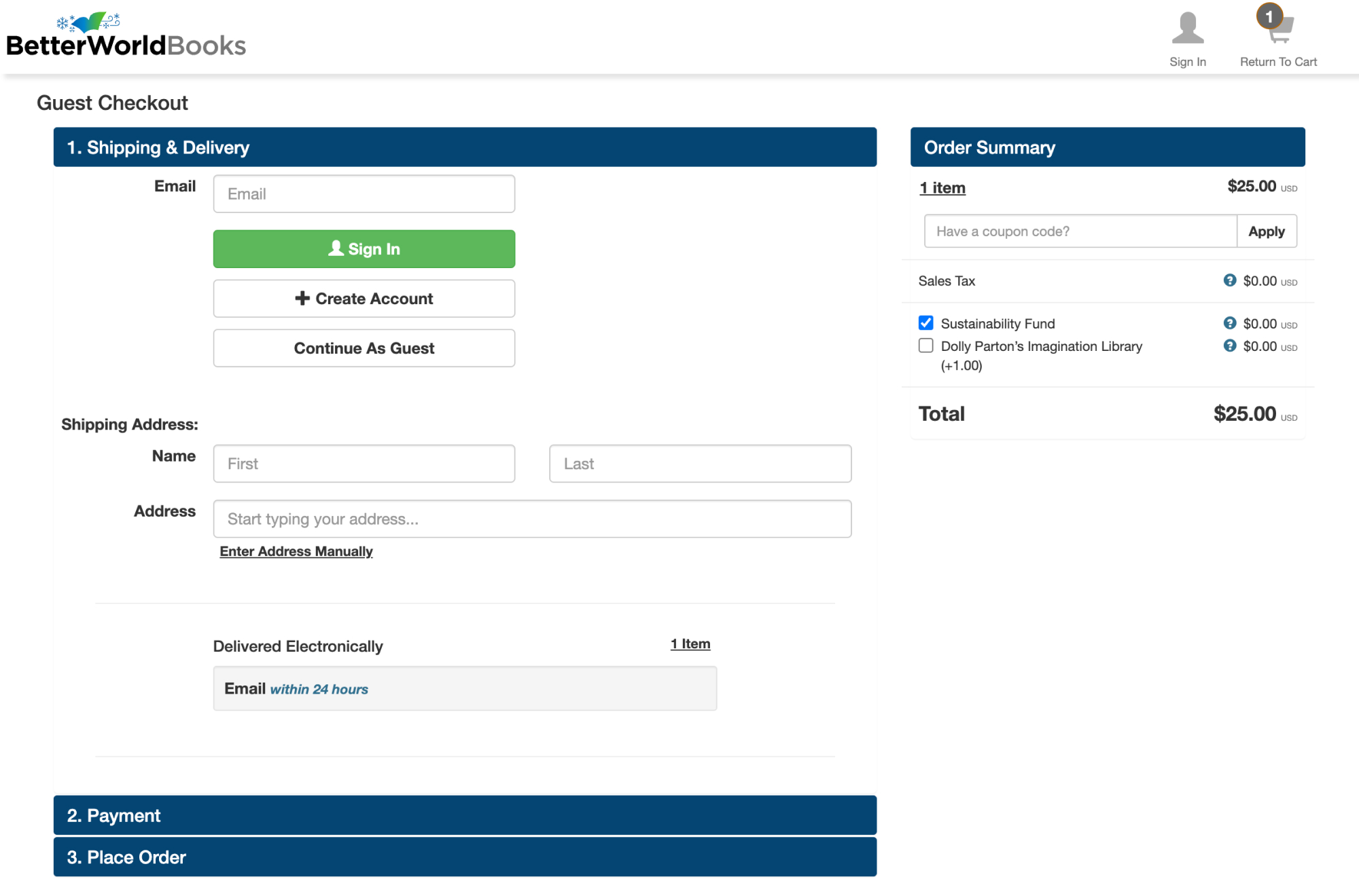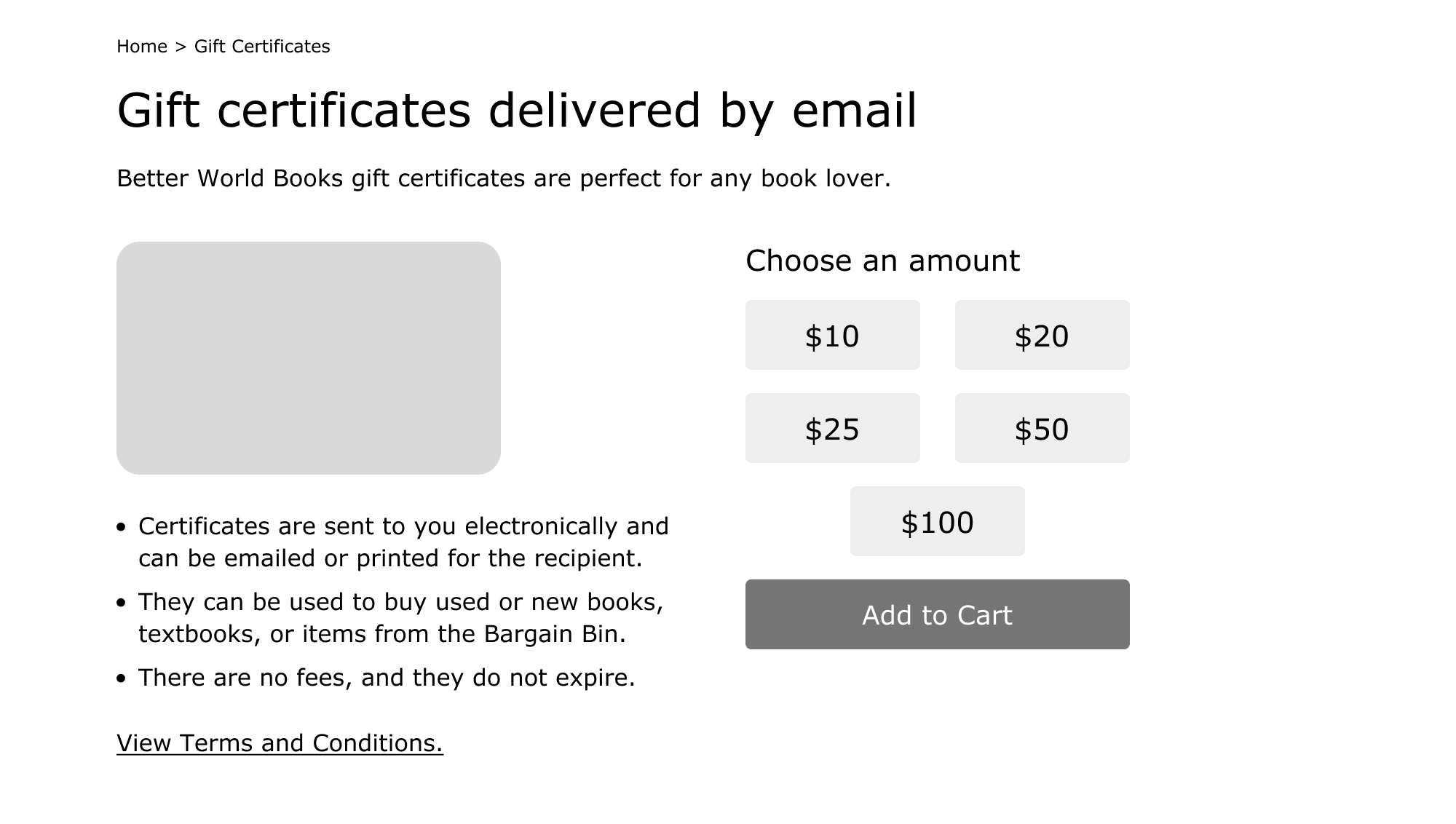 When I got to the Checkout page (see below), I expected, from similar experiences with other online bookstores, that Better World Books would deliver the digital gift certificate directly to the recipient.