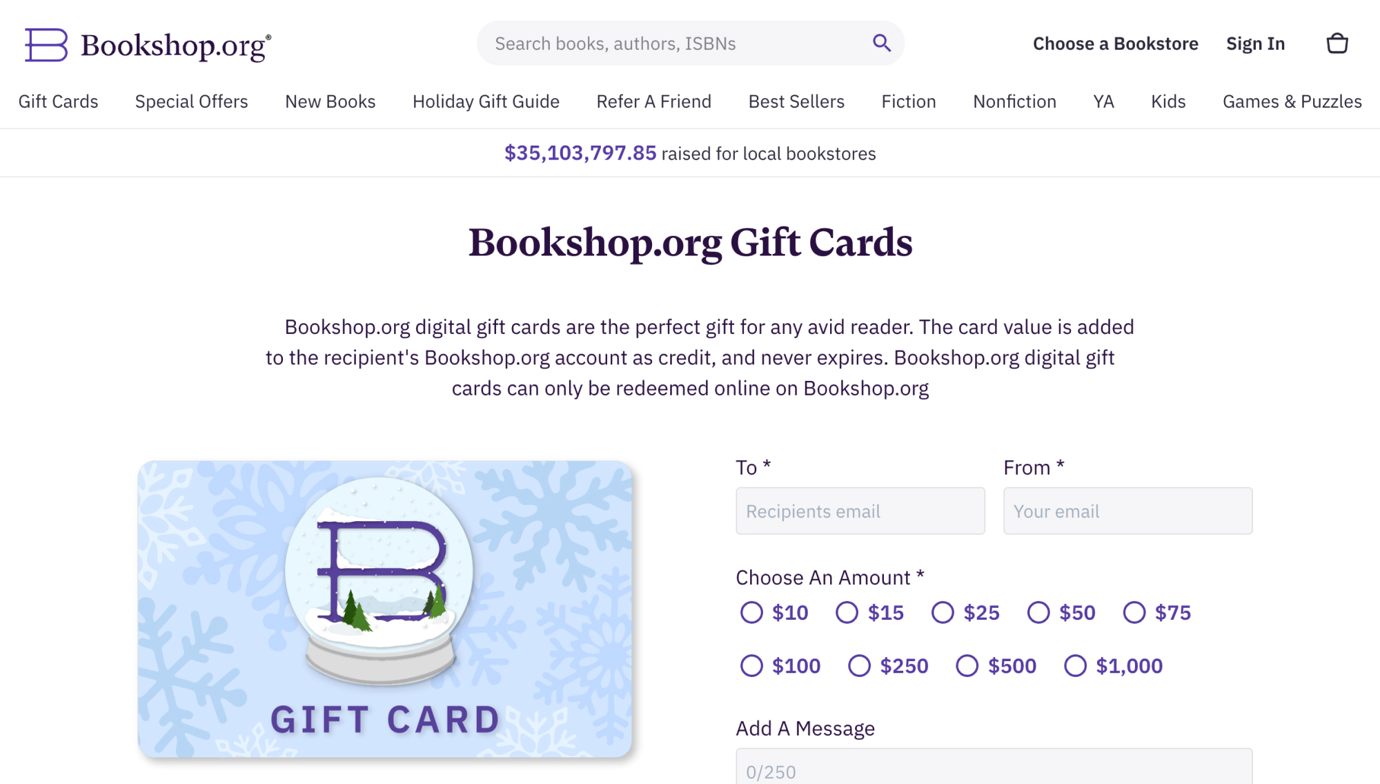 Bookshop.org’s Gift Cards page clearly communicates how the gift card will be delivered, who receives it, and where personalization occurs.